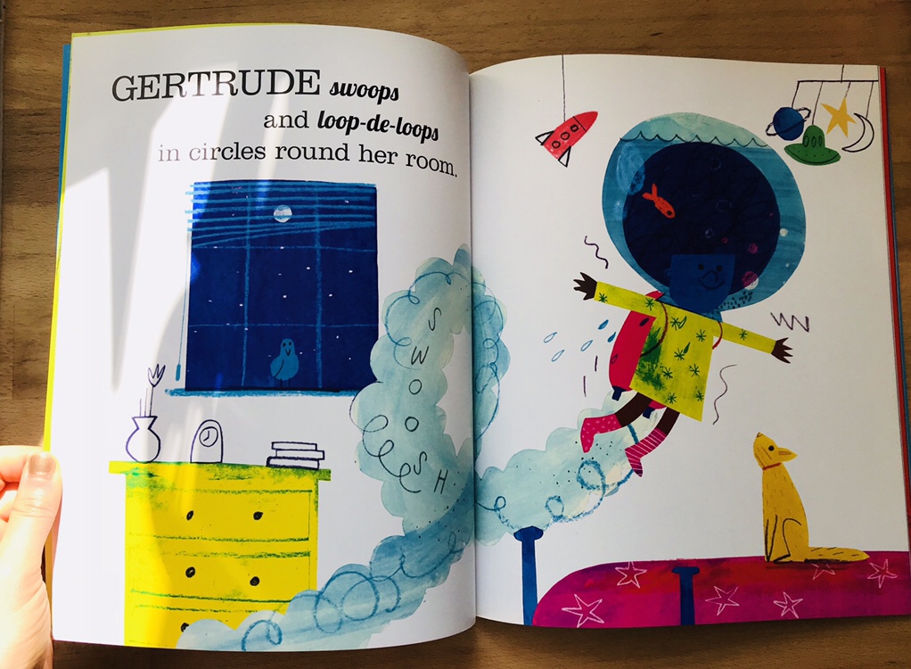 What makes this hilarious picture book extra special is the Jarvis’ colourful and playful illustrations. His hand-drawing x digital collage is rendered in gorgeous colours, and his interpretation of the texts is imaginative and humorous that I can totally fall for. For example, Gertrude who sweeps and loop-de-loops in circles round her room wears a fish bowl like an astronaut (with water and fish are still in it).