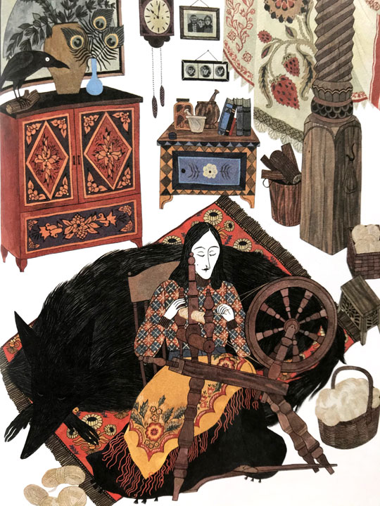 Julia Sadra‘s unique and retro-inspired illustration is a perfect paring for this fairy tale. Like in Sweep, another book illustrated by Sadra, I shared last October, her colour palette is perfect for autumn and it beautifully delivers emotional depth. And I love the way that the setting gradually transforms from autumn to winter, perfect for the peaceful ending. I also like the use of decorative borders to add the old book feel. Clever.