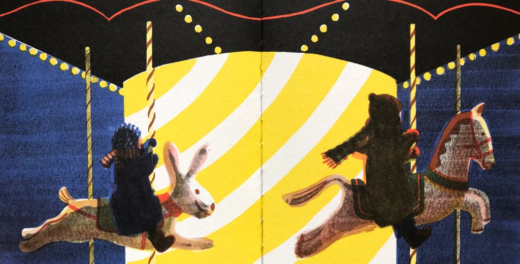 I don’t know how Junko Nakamura creates her illustrations but they are beautiful. They reminds me of picture books I read when I was small. What is amazing about the illustrations in this book is how she captures the lights and shadows. From the late afternoon sunlight to the lights on the carousel and shop windows in the evening to the living room lamp stand in the night, Nakamura captures lights so skilfully that you don’t need text to tell the time passing. I think not having any text is a perfect choice. The absence of text creates room for contemplation and imagination.