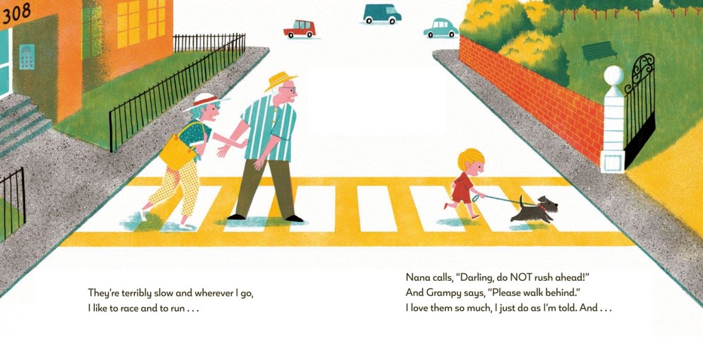 A walk in the park with Nana and Gramps is always a lot of fun, but they’re terribly slow and their grandchild isn’t allowed to race ahead. Walking dutifully behind them, the child is soon joined by a long line of fantastical characters: a bear, a monster from the sewers, a pirate and his crew . . . Those grandparents would never believe who else is on their walk, if only they’d look behind them!